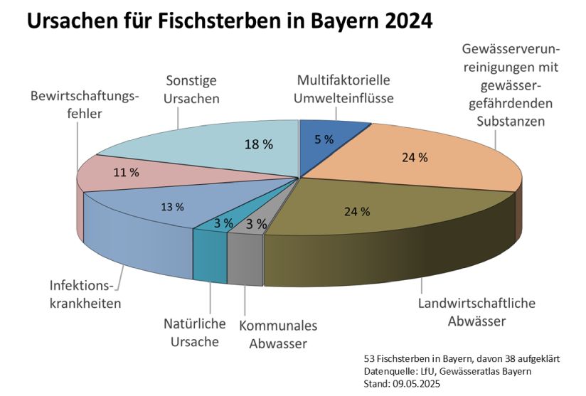 Fischsterben können durch vielfältige Ursachen ausgelöst werden. Diese zu ermitteln, ist Aufgabe der Polizei und des örtlich zuständigen Wasserwirtschaftsamts. Diese veranlassen vor Ort die Sicherstellung von Gewässerproben und Fischen. Das LfU ist in Bayern zentral für die tierärztlichen und chemischen Untersuchungen zuständig. Pro Jahr werden etwa 50 Vorfälle an das LfU gemeldet.