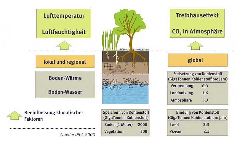 Bei der Speicherung von Kohlenstoff im Boden spielen vor allem Pflanzen eine große Rolle. Sie nehmen Kohlenstoff über die Photosynthese aus der Luft auf und geben einen Teil durch Wurzelatmung wieder an den Boden ab. Ein weiterer Teil stammt von abgestorbenen Pflanzen, die im Boden zersetzt werden und in Humus umgewandelt werden. Besonders humusreiche Böden können große Mengen CO2 langfristig binden. Moore haben hierbei eine besondere Bedeutung, da sie im Vergleich zu anderen Böden hohe Mengen an Kohlenstoff speichern – vor allem, solange sie intakt sind.