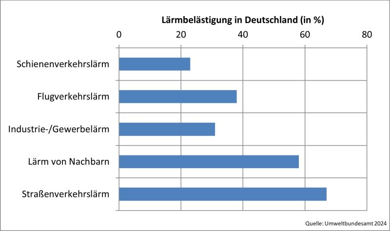 Etwa zwei Drittel der Bevölkerung gaben in einer Umfrage des Umweltbundesamtes (UBA) an, sich durch Straßenverkehrslärm belästigt zu fühlen (Quelle: UBA 2025). Straßen sind daher Lärmquelle Nummer 1 und führen ebenso wie Schienenverkehrswege - im Gegensatz zu Gewerbe-und Industriegebieten - insbesondere in den Siedlungsgebieten zu einer weitreichenden Verlärmung.