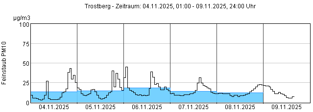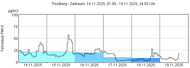 Feinstaub PM10: Tagesmittelwerte und 1-Stundenmittelwert von heute und den letzten 5 Tagen