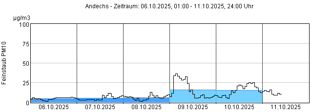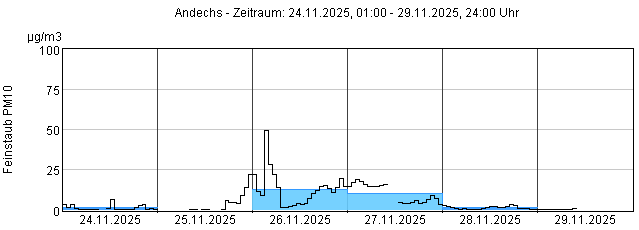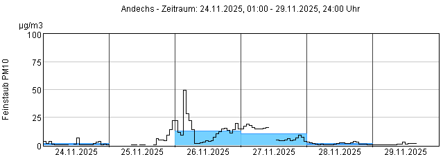 Feinstaub PM10: Tagesmittelwerte und 1-Stundenmittelwert von heute und den letzten 5 Tagen