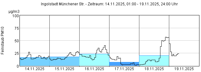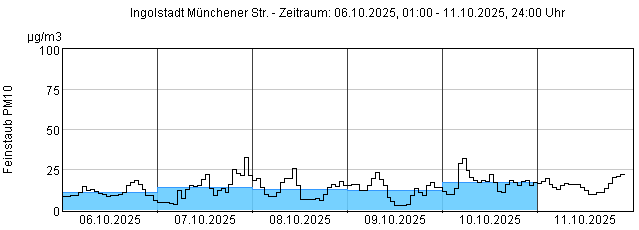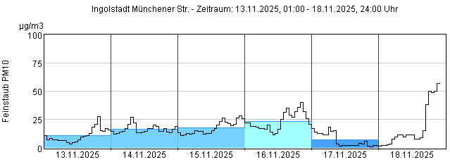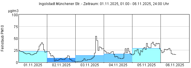 Feinstaub PM10: Tagesmittelwerte und 1-Stundenmittelwert von heute und den letzten 5 Tagen