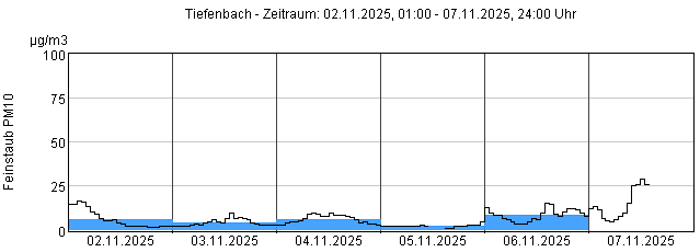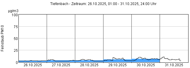 Feinstaub PM10: Tagesmittelwerte und 1-Stundenmittelwert von heute und den letzten 5 Tagen