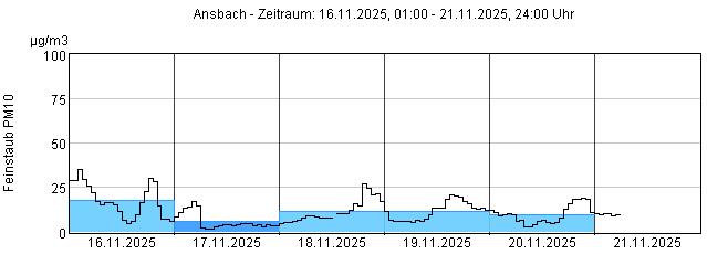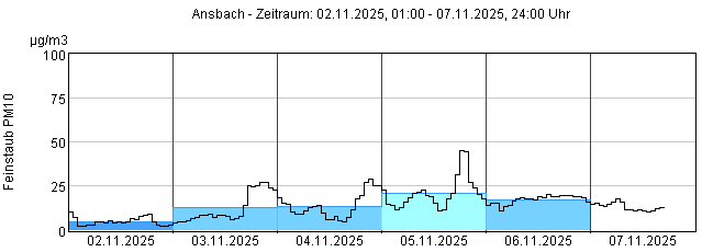 Feinstaub PM10: Tagesmittelwerte und 1-Stundenmittelwert von heute und den letzten 5 Tagen