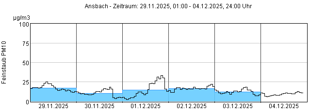 Feinstaub PM10: Tagesmittelwerte und 1-Stundenmittelwert von heute und den letzten 5 Tagen