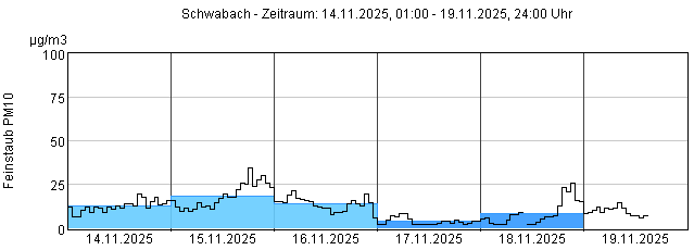 Feinstaub PM10: Tagesmittelwerte und 1-Stundenmittelwert von heute und den letzten 5 Tagen