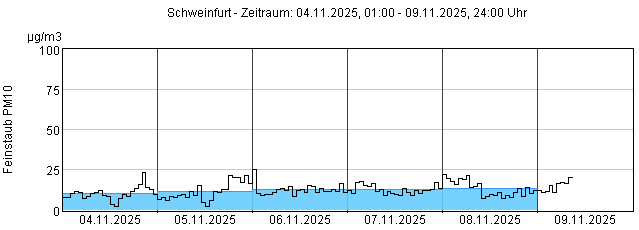 Feinstaub PM10: Tagesmittelwerte und 1-Stundenmittelwert von heute und den letzten 5 Tagen