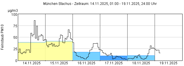 Feinstaub PM10: Tagesmittelwerte und 1-Stundenmittelwert von heute und den letzten 5 Tagen