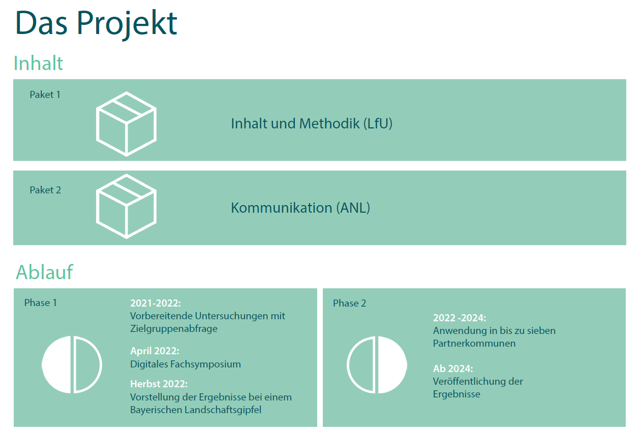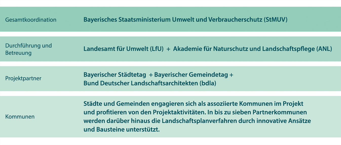 Neben fachlicher Unterstützung erhalten die Kommunen passgenaue Kommunikations- und Beteiligungskonzepte für ihren Landschaftsplan. Die Erfahrungen in den Partnerkommunen werden im weiteren Verlauf für eine bayernweite Anwendung aufbereitet.
