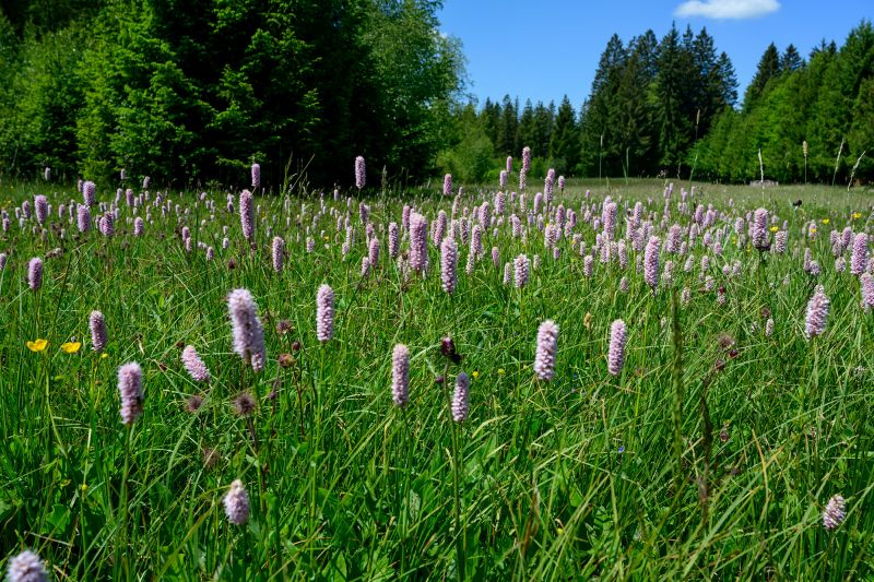 Typischer Lebensraum des Blauschillernden Feuerfalters (Lycaena helle): Feuchtwiese mit Schlangen-Knöterich (Bistorta officinalis), der wichtigsten Raupennahrungspflanze des blauschillernden Feuerfalters; Foto: Thomas Gretler
