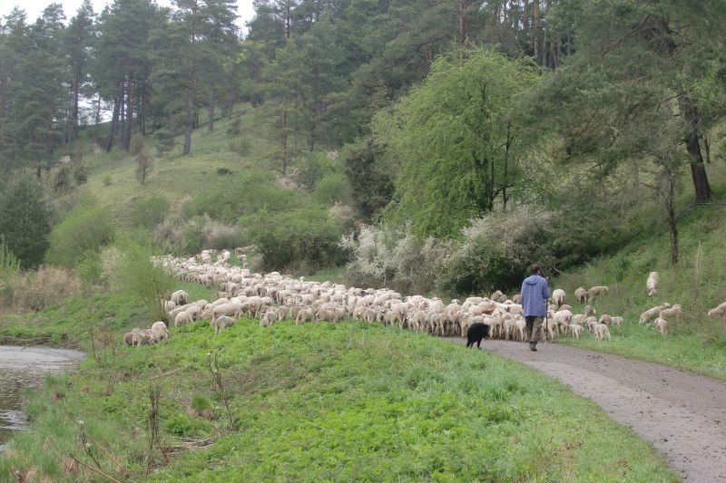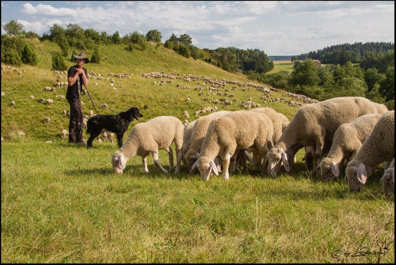 Wanderschäfer mit Schafherde unterwegs an den Trockenhängen des Tals der Schwarzen Laber, ebenfalls in der Modellkommune Lupburg. Bei einem Flächenkauf konnten kürzlich 13,4ha gekauft und somit langfristig für den Biotopverbund gesichert werden; Foto: Agnes Hofmann