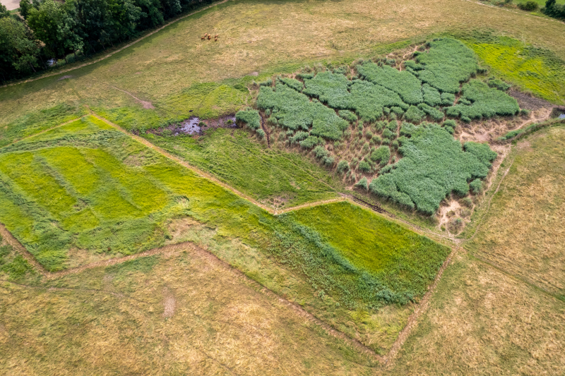 Übersicht über den seit April 2023 mit Wasserbüffeln und Murnau-Werdenfelser Rindern extensiv beweideten Niedermoorkomplex in der Rott-Aue südwestlich von Massing; Foto: David Schmidt, schmidtmedia / Heinz Sielmann StiftungUnter Verwendung von Ersatzgeldern wurde zudem die Zäunung der Moorfläche finanziert, so dass seit April 2023 eine extensive Beweidung mit Wasserbüffeln und Murnau-Werdenfelser Rindern im Rahmen des Vertragsnaturschutzprogrammes durchgeführt werden konnte.