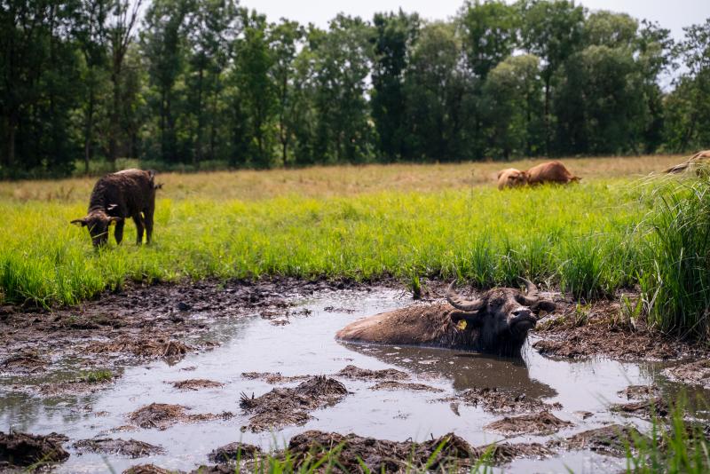 Zur Verbesserung des Nährstoffhaushalts und der Strukturvielfalt wird die Niedermoorfläche im Bereich der Rott-Aue mit Wasserbüffeln und Murnau-Werdenfelser Rindern extensiv beweidet; Foto: David Schmidt, schmidtmedia / Heinz Sielmann StiftungZur Stabilisierung des Wasserhaushaltes und zur Verbesserung der Lebensraumverhältnisse niedermoortypischer Pflanzen- und Tierarten werden im Bereich des Niedermoorkomplexes Massing Entwässerungseinrichtungen rückgebaut und die landwirtschaftliche Nutzung zur Verbesserung des Nährstoffhaushalts mittels Beweidung extensiviert. Seit April 2023 wird die noch relikthaft erhaltene, am südwestlichen Ortsausgang von Massing gelegene, fast sechs Hektar große Niedermoorfläche daher mit Wasserbüffeln und Murnau-Werdenfelser Rindern beweidet. Um die weitere Entwicklung der Artenvielfalt im Bereich der Niedermoorfläche zu dokumentieren, werden zudem Daten zur Vogelwelt, zur Zikaden- und Heuschreckenfauna sowie zur Flora und Vegetation erhoben.