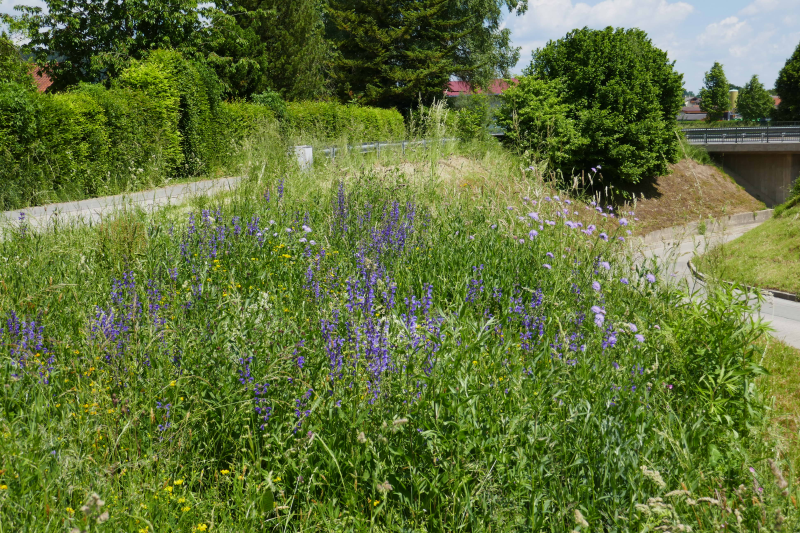 Die Vorbereitungen zur Durchführung sowie die Aufnahme aller kommunaler Flächen dauerten von 2019 bis 2021. Anschließend wurden durch das Landschaftsarchitekturbüro Pflegehinweise für ca. 6.000 von 10.000 Flächen erstellt (ein Teil der Flächen wie z.B. Flächen im Wald oder Lagerflächen wurden nicht berücksichtigt). Der Abschluss der theoretischen Arbeit mündete in elf gemeindebezogene Praxishandbücher. Damit war der erste Meilenstein geschafft. Die langwierige Suche nach einem „Kümmerer“, der die Kommunen bei der Umsetzung unterstützt, wurde im Dezember 2023 durch die Förderzusage des Umweltministeriums im Rahmen der LNPR-Richtlinien von Erfolg gekrönt. Durch die Mitwirkung des Landschaftspflegeverbands Traunstein, der die Förderung in Abstimmung mit der Ökomodellregion beantragte, konnte im Dezember 2024 ein Mitarbeiter als „Kümmerer“ für sechs der beteiligten Gemeinden im Landkreis Traunstein eingestellt werden, der über theoretische und praktische Kenntnisse für Landschaftsökologie verfügt und sowohl die Bauhöfe als auch Landwirte, die einen Teil der kommunalen Flächen pflegen, bei der Umsetzung berät. Für weitere drei Gemeinden ist eine entsprechende Umsetzungsstelle geplant. Das über vier Jahre angelegte Projekt soll dafür sorgen, dass die erarbeiteten Praxishandbücher nicht in Schubladen verschwinden, sondern aktiv zur Biotopvernetzung in den teilnehmenden Kommunen beitragen. Insbesondere sollen die Wegränder in den Mittelpunkt gestellt werden. Denn mit einer richtigen Pflege können diese die Biodiversität auf kommunalen Flächen erheblich steigern. Straßen hören nicht an Gemeindegrenzen auf, sie verbinden nicht nur Menschen, sondern auch Biotope für Insekten.