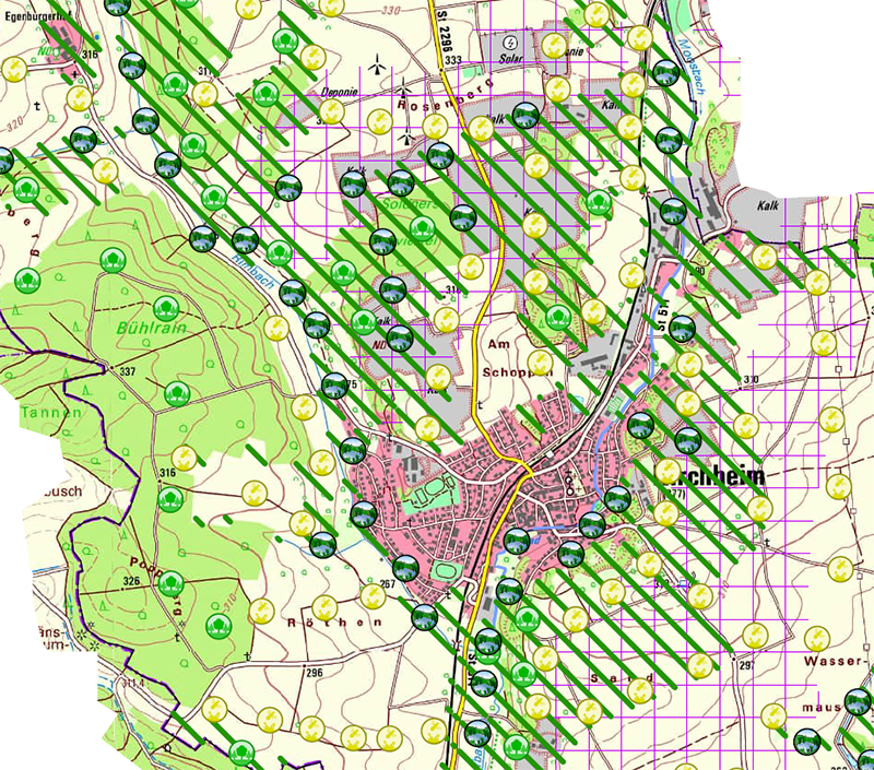 Mit Hilfe einer Überlagerungsanalyse wurden die vorhandenen Bestandsdaten mit den Meldungen der PAG und den Zielvorgaben des Regionalplans zusammengeführt. Hieraus entstand eine Leitbild- und Maßnahmenkarte, die genau zeigt, wo im Gemeindegebiet der Biotopverbund am effektivsten gestärkt werden kann.