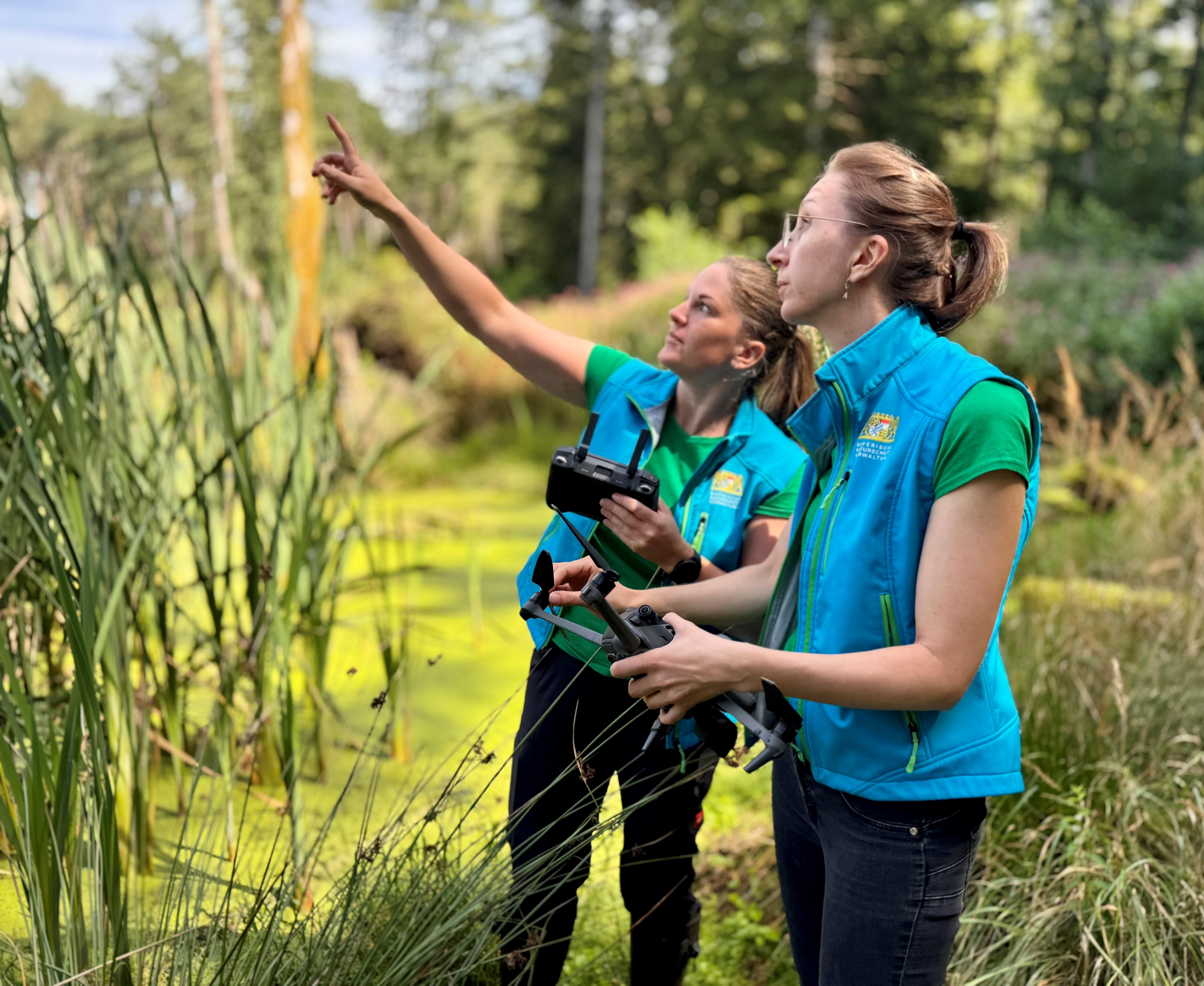 Die Drohne fliegt über dem Münsinger Filz Nadine Gebhardt (rechts) und Dr. Theresa Lehmair vom Bayerischen Artenschutzzentrum im Landesamt für Umwelt