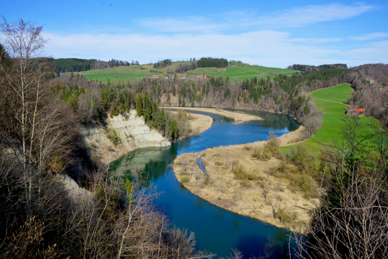 Schon nach wenigen Kilometern erreichen Sie einen Aussichtspunkt. Vor Ihnen erstreckt sich eine idyllische Auenlandschaft, die bis zum Horizont reicht und Ihnen den Atem raubt. Sie lassen den Blick schweifen und genießen den Augenblick. Der Fluss mäandert in großen Schleifen durch eine abwechslungsreiche Landschaft mit Feldern, Wiesen und Wäldern. Die Wolken spiegeln sich im Blau des Flusses und in der Ferne glitzert das Sonnenlicht auf der Wasseroberfläche. Ihr Blick folgt seinem Lauf und Sie erkennen Steilhänge auf einer und flache Kiesbänke auf der anderen Uferseite.