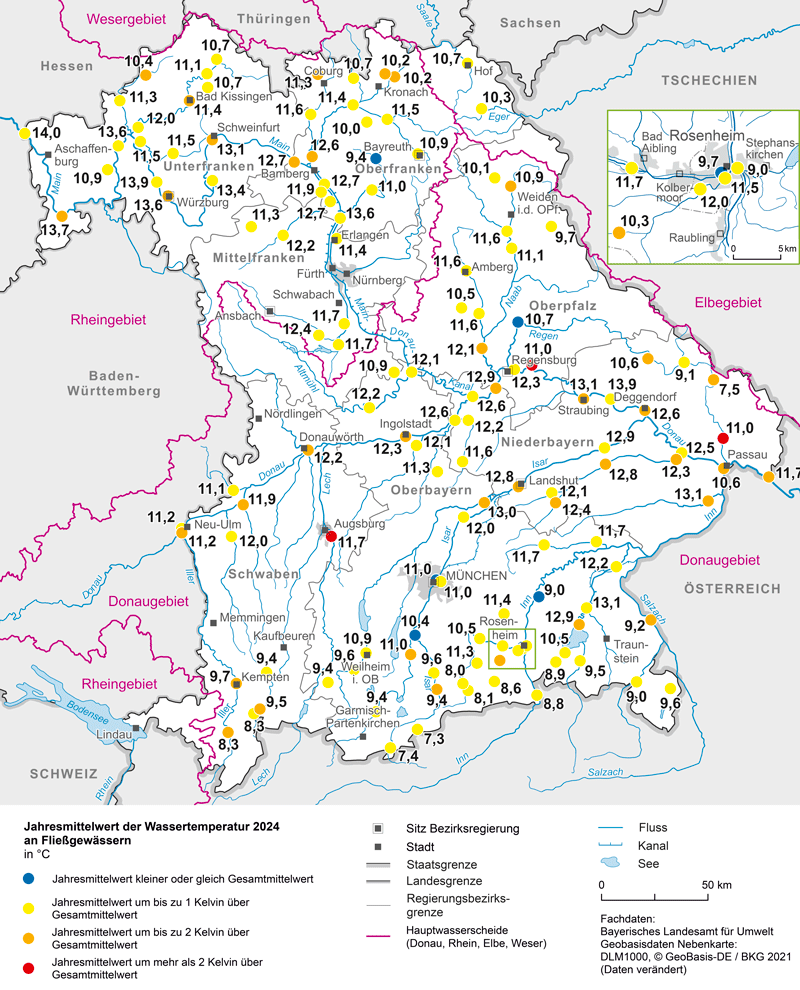 Am Pegel Windischeschenbach/Waldnaab wird der Jahresmittelwert der Wassertemperatur für 2024 mit 10,9°C festgestellt. Dieser Wert liegt um 1,7 Kelvin über dem Gesamtmittelwert von 9,2°C aus allen beobachteten Jahren (Beobachtungszeitraum 31 Jahre). An der Messstelle Kempten/Iller liegt der Jahresmittelwert in 2024 mit 9,7°C um 1,2 Kelvin über dem Gesamtmittelwert von 8,5°C (Beobachtungszeitraum 25 Jahre).