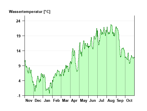 Ab Anfang September nehmen die Temperaturwerte an beiden Stationen stetig ab, wobei es immer wieder zu Wärmespitzen kommt, auf welche kurze Zeiträume der Abkühlung folgen. Zum Ende des hydrologischen Jahres im Oktober liegen die niedrigsten Temperaturen bei 8,7°C an der Messstelle Windischeschenbach und bei 8,5°C an der Messstelle Kempten.