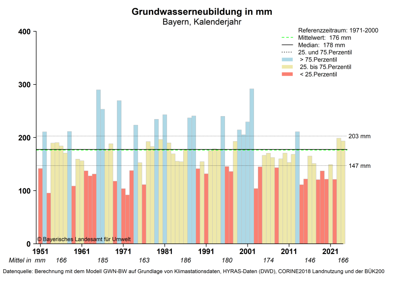 Mit dem Bodenwasserhaushaltsmodell GWN-BW wurde die Grundwasserneubildung aus Niederschlag in Bayern im Zeitraum von 1951 bis 2024 berechnet. Die jährlichen Grundwasserneubildungsraten im Zeitraum 1951 bis 2002 waren durch einen Wechsel von zum Teil auch mehrjährigen Nass- und Trockenperioden charakterisiert, wobei die Auffüllung der Grundwasserspeicher überwiegend während der neubildungsreichen Nassjahre erfolgte. Im Gegensatz dazu wies die Periode 2003 bis 2024 mit zumeist durchschnittlichen bis trockenen, das heißt neubildungsarmen Jahren, eine geringe Variabilität in regional unterschiedlicher Ausprägung auf. Dies wird bei Betrachtung der letzten 10 Jahre (2015 bis 2024) deutlich. Die mittlere jährliche Grundwasserneubildung in Bayern betrug seither nur 148 mm pro Jahr. Dies entspricht einem Defizit von rund 16% gegenüber dem Referenzzeitraum 1971 bis 2000 (176mm pro Jahr). Innerhalb der letzten 10 Jahre wiesen lediglich die Jahre 2023 und 2024 überdurchschnittliche Grundwasserneubildungsraten auf.