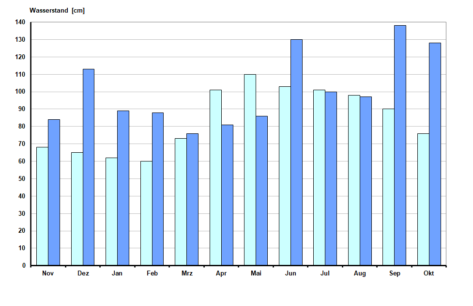 Abbildung 2: Wasserstand am Pegel Stock/Chiemsee – Gegenüberstellung Monatsmittelwerte 2024 (dunkelblau) und langjährige Monatsmittelwerte (hellblau) der Jahre 1907 bis 2024 (Rohdaten)Der mittlere jährliche Wasserstand 2024 des Chiemsee liegt 17cm über dem langjährigen Mittelwert – ein Mittelwert, der zuletzt 1967 überschritten wurde. Im Vergleich zu dem typischen Jahresverlauf der Wasserstände mit den niedrigsten Werten in den Wintermonaten und den höchsten im Spätfrühling/Frühsommer zeigt das Jahr 2024 für die Jahreszeit dementsprechend höhere mittlere monatliche Wasserstände im Januar bis März und im Juni, September und Oktober. Nur die Monate April und Mai weisen aufgrund der geringen Zuflüsse unterdurchschnittliche Wasserstände auf.