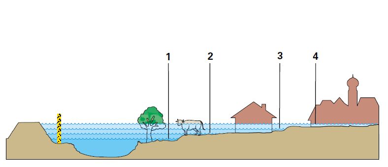 Um über das Ausmaß von Überschwemmungen einfach und klar zu informieren, wird es mit Hilfe von 4 Meldestufen beschrieben.